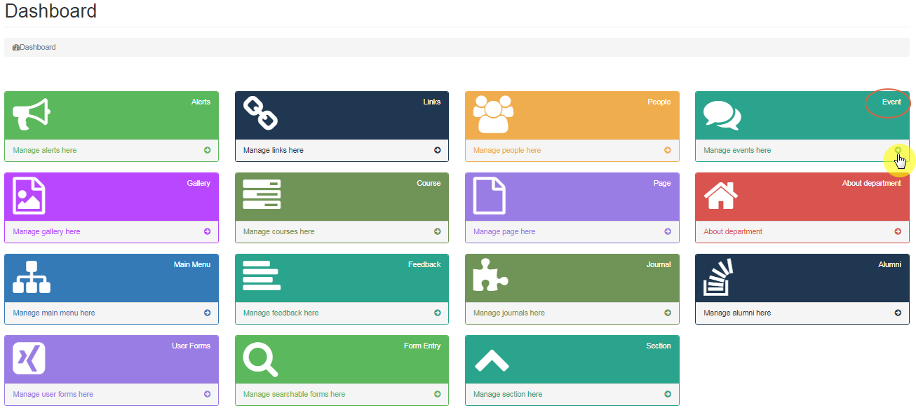 To keep a note of all the events, so that students are kept informed, every department has an event section on their website. Any Update on event is highlighted in events section and future events also scroll in Upcoming Events.